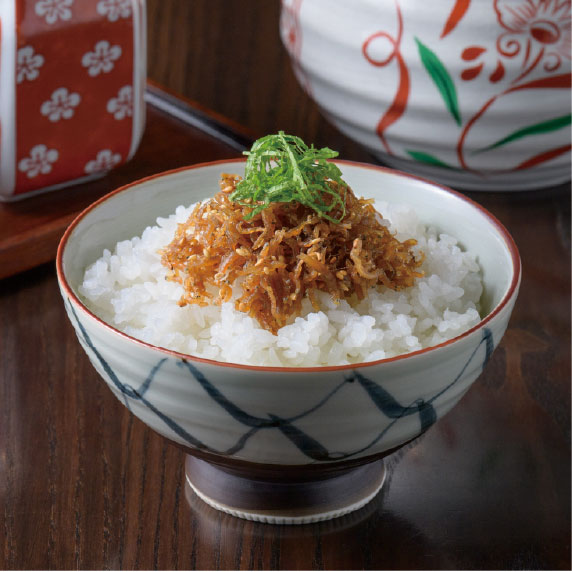 和歌山市本脇にある老舗『山利』の新鮮な釜揚げしらすを使用。アツアツのご飯の上にたっぷりのしらすと大葉を乗せ、相性の良い専用のオリジナルだし醤油で味付けしています。